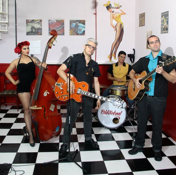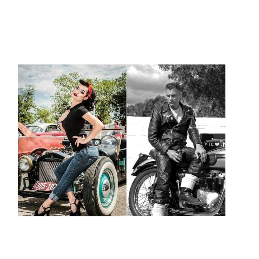 Las mujeres suelen usar Vestidos de swing y faldas de vuelo, son prendas populares en la moda rockabilly que realzan la figura femenina, Tops con escote bardot: Los zapatos de tacón alto son una elección común en el estilo rockabilly, especialmente los modelos con punta redondeada o cuadrada. Estos añaden un toque de elegancia y feminidad Peinados y maquillaje vintage, lucen peinados como el “Victory Rolls” con rizos y labios rojos brillantes, que eran populares en los años 50.Tatuajes en estilo tradicional son comunes y accesorios retro estos incluyen flores, bandanas y gafas de sol de época.